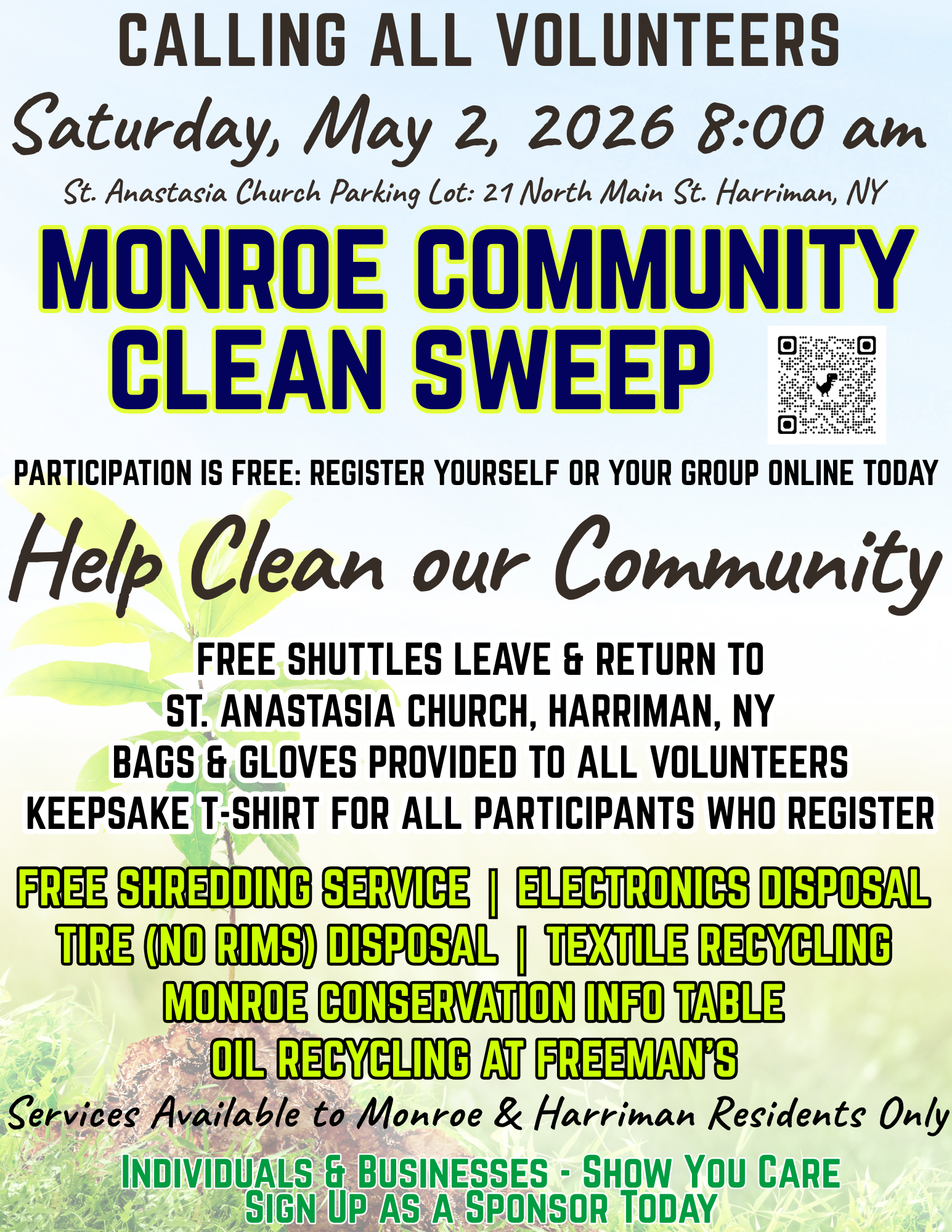 Monroe Clean Sweep will be conducted from 8 AM to 12 PM, with the event beginning at the St. Anastasia Church Parking Lot in Harriman. The cleanup will focus on the portion of Route 17M from Airplane Park in the Village of Monroe to the intersection of Routes 17 and 17M the Village of Harriman. Some ancillary roads in the villages will be included depending on the number of volunteers.