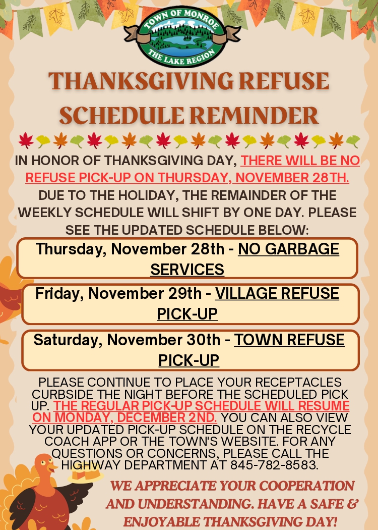 17 November Monroe Dial-A-Bus Thanksgiving Holiday Schedule November 17, 2023 By Town Clerk . Community News, General, Town Hall News 0 Please click here for information regarding Monroe Dial-A-Bus Thanksgiving Holiday Schedule. Related Articles Thanksgiving Holiday Schedule for Town of Monroe Offices Thanksgiving Holiday Schedule for Town of Monroe Offices. Public Workshop: Village of Monroe Drinking Water Source Protection Plan, Monday September 19, 2022 at 6:00 PM (Monroe Town Hall 1465 Orange Tpke., Monroe, NY) Public Workshop: Village of Monroe Drinking Water Source Protection Plan, Monday September 19, 2022 at 6:00 PM (Monroe Town Hall 1465 Orange Tpke., Monroe, NY) Click HERE for more information. Thanksgiving Holiday Refuse Schedule Reminder Thanksgiving Holiday Refuse Schedule Reminder. Thanksgiving Holiday Refuse Schedule Reminder Thanksgiving Holiday Refuse Schedule Reminder. Town of Monroe Planning Board Workshop Meeting Thursday, August 11, 2022 at 6:00 PM (Monroe Town Hall 1465 Orange Tpke., Monroe) Please click here to view the Agenda. The Town of Monroe is pleased to announce the return of in-person Planning Board Workshop Meetings at Town Hall, 1465 Orange Turnpike, Monroe, New York. Given the current times, please note the following procedures that must be adhered to should you choose to attend a meeting: - Meeting attendees arriving prior to the 6 p.m. meeting start time should enter through the upper level doors where a contactless temperature check will be conducted. To assist in contact tracing efforts, meeting attendees will be asked to provide their name and contact information. Any individual who shows signs of an elevated body temperature of 100.4 will be asked to return home immediately and contact their physician. - Lastly, please continue to be respectful of others by remaining at home should you feel ill or exhibit any symptoms of COVID-19. We appreciate your cooperation in adhering to our safety guidelines and thank you for your ongoing patience and support! Town of Monroe Planning Board Regular Meeting Tuesday, August 16, 2022 at 6:00 PM (Monroe Town Hall 1465 Orange Tpke., Monroe) Please click here to view Agenda. The Town of Monroe is pleased to announce the return of in-person Planning Board Regular Meetings at Town Hall, 1465 Orange Turnpike, Monroe, New York. Given the current times, please note the following procedures that must be adhered to should you choose to attend a meeting: - Meeting attendees arriving prior to the 6 p.m. meeting start time should enter through the upper level doors where a contactless temperature check will be conducted. To assist in contact tracing efforts, meeting attendees will be asked to provide their name and contact information. Any individual who shows signs of an elevated body temperature of 100.4 will be asked to return home immediately and contact their physician. - Lastly, please continue to be respectful of others by remaining at home should you feel ill or exhibit any symptoms of COVID-19. We appreciate your cooperation in adhering to our safety guidelines and thank you for your ongoing patience and support! Comments are closed.